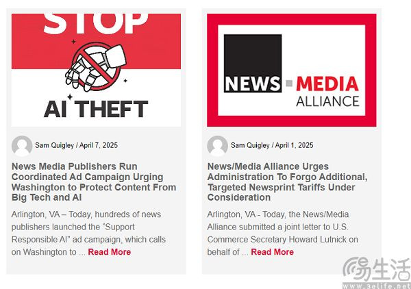 日前,代表全美2200多家新闻机构的新闻/媒体联盟(News/Media Alliance)发起“支持负责任AI”运动,打出了“保护工作免受AI窃取”、“AI也在偷你的内容”等口号,要求AI企业对内容创作者进行公平补偿,并强制AI生成的内容标注来源、禁止垄断性企业实施胁迫或反竞争操作。